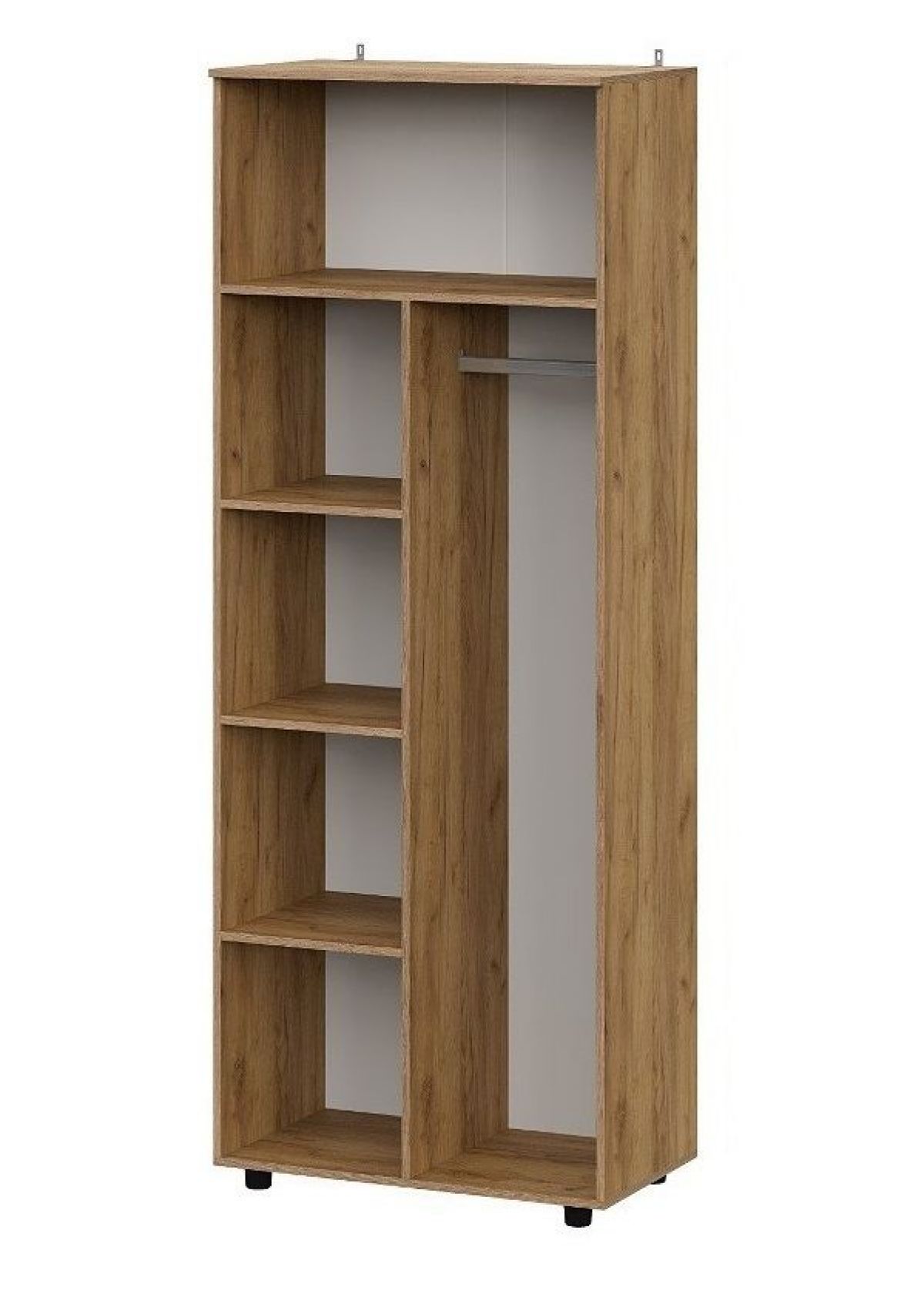 В левой части шкафа расположен отсек с тремя полками, в правой части шкафа расположен отсек со штангой (присадка под штангу отсутствует, покупатель устанавливает ее самостоятельно), над обоими отсеками установлена стационарная полка на всю ширину шкафа.