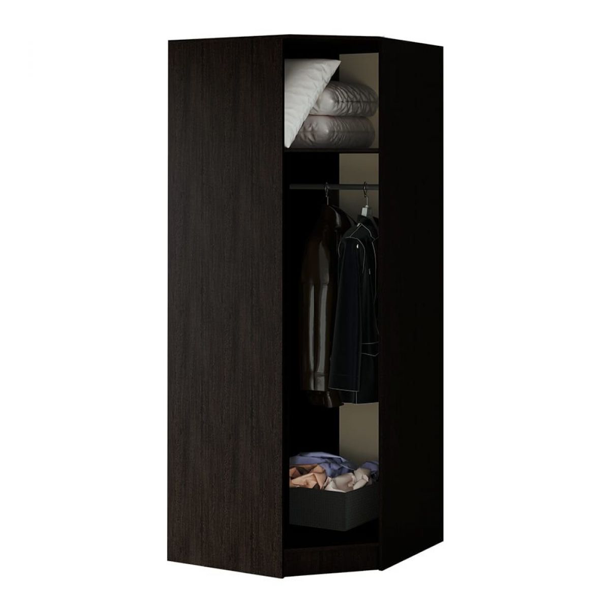 Рационально использовать пространство в комнате, при этом организовать хранение гардероба поможет угловой шкаф Фиеста. Модель изготовлена с использованием классической комбинации цветов венге и лоредо и будет прекрасно смотреться в любом интерьере. Внутренне наполнение со штангой и многочисленными полками позволит разместить одежду и обувь.